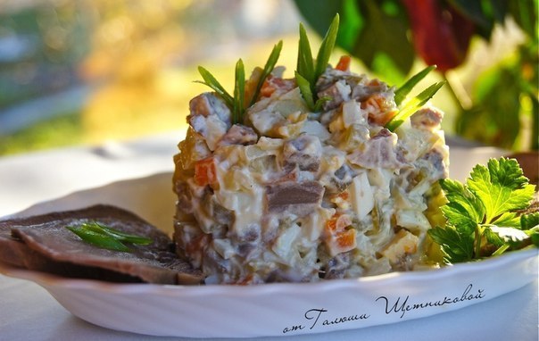 А-ля «оливье»! Советую приготовить проще:язык говяжий,яйца отварные,лук репчатый.слегка маринованный,или лук белый салатный-главное что бы он не был горьким,немного майонеза(или сметана с горчицей) сверху.И для пикантности чуть-чуть кайенского перца.Все резать крупно и не перемешивать.