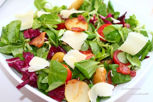 Помидоры разрезать и соединить с салатом и оливками, посолить, поперчить, полить оливковым маслом и яблочным уксусом. Салат перемешать, выложить на блюдо, посыпать базиликом. Сыр нарезать тонкими пластинками и вместе с беконом выложить на салат. Картофель вынуть из духовки и тоже выложить на салат.