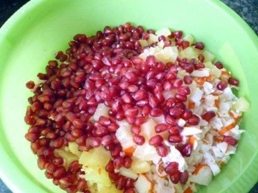4. Смешать креветки, палочки, капусту, ананасы и гранат.