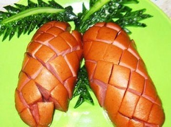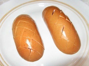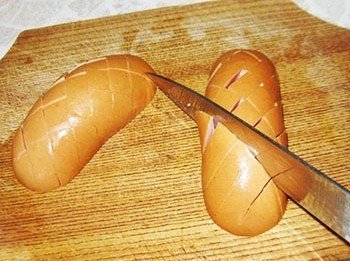 Вариант 3. При необходимости приготовления большого количества порций, смазать надрезанные сардельки маслом и обжарить в духовке.