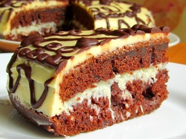 Торт получился …ну очень вкусный – в меру сладкий (напомнил мне вкус из детства и юности моих любимых шоколадных пироженок).