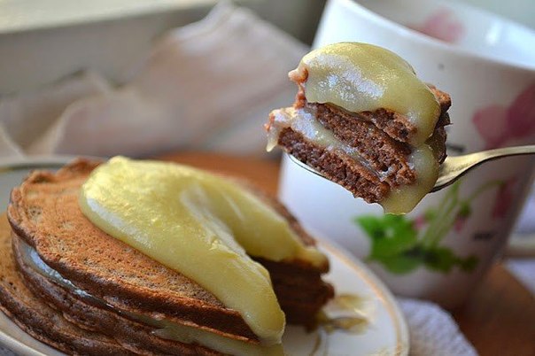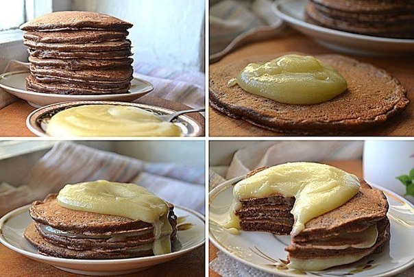 Оладки перемазать Заварным кремом, дать постоять 10 мин.