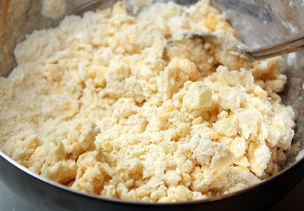 Для теста соединяем холодное масло с просеянной мукой, быстро измельчаем в крошку, не давая нагреться. Добавляем в тесто 2 желтка и пару столовых ложек рома. Мешаем ложкой, а затем быстро делаем тесто, собирая его в одно целое.
