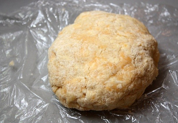 Тесто может быть неоднородным, оно только должно собраться в шар, который нужно завернуть в пленку и убрать в холодильник на час.