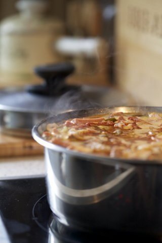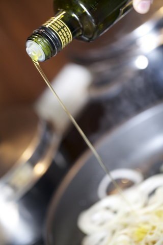 3. Спассеровать лук с томат-пюре на оливковом масле. Закладываем в кипящий бульон мясо, колбасные изделия – даем закипеть.