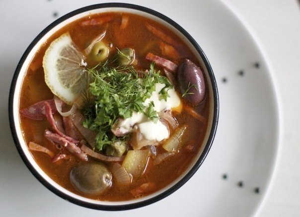 кусочка лимона и одна маслина,должны плавать в солянке…….