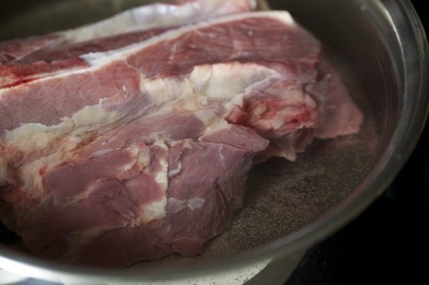 1. Ставим варить мясо. Бульон для солянки правильный – должен быть крепкий, насыщенный. Но, если для вас это слишком – то можно сварить бульон из небольшого кусочка с косточкой, а такой крепкий бульон разбавить водой.
