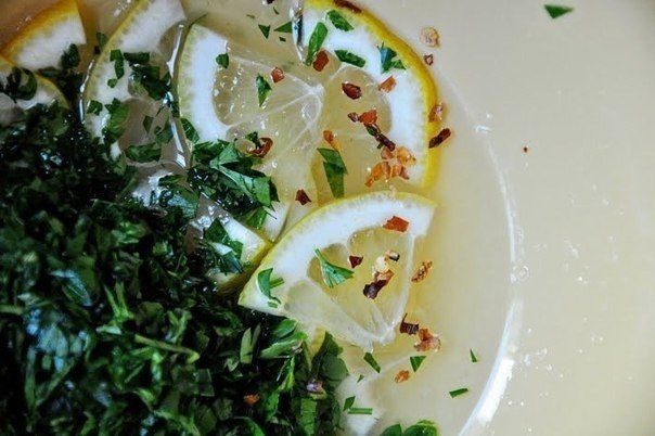3. Сок и дольки лимона выложите в миску. Вымойте и мелко нарубите петрушку.