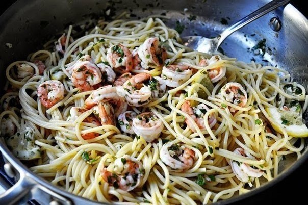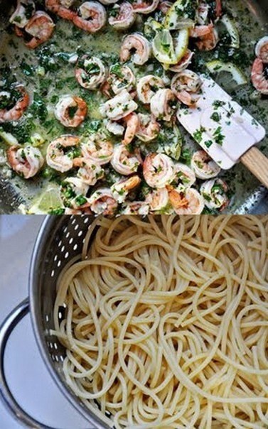 6. Затем добавьте петрушку с лимоном. Слейте пасту и переложите в сковороду с креветками. Перемешайте тщательно.