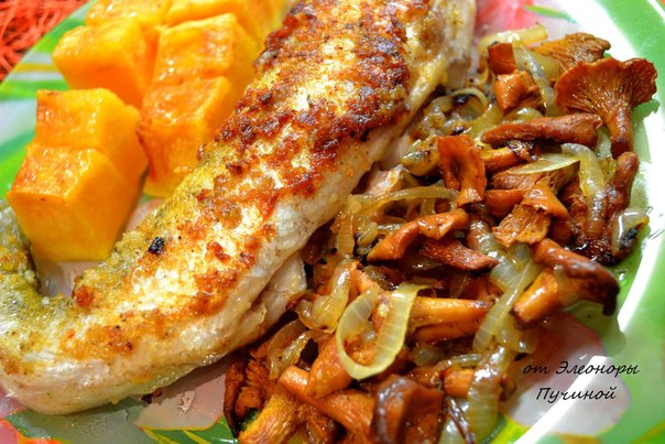 Подготовленную рыбу обвалять в панировочных сухарях и обжариваем до готовности.На другой сковородке обжарить лисички с луком,добавить перца и соль по вкусу.Тыкву нарезать порционными кусочками-посолить,полить подсолнечным маслом и поставить в духовку при180-200гр.до готовности или в микроволновку на 10мин.