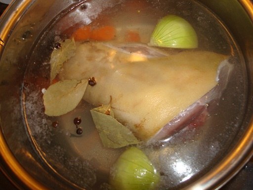 В первую очередь я поставила свиную рульку вариться в чуть подсоленной воде с половинкой луковицы и морковки, лавровыми листиками и душистым перцем. Варится свиная рулька около 2-х часов.