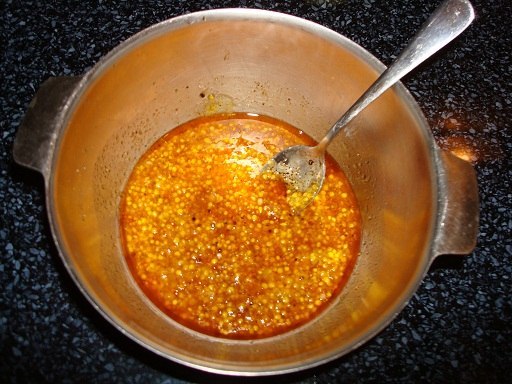 В это время можно приготовить маринад для свиной рульки. Для этого чеснок пропускаем через пресс, добавляем 50 гр. французской горчицы, 1 ст. л. меда, смесь перцев и 1 ст. л. оливкового масла.
