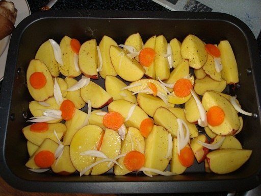 Далее готовим овощи: моем и режем на четвертинки картофель. Я взяла молодой, поэтому чистить его не стала. Оставшиеся половинки моркови режем кружочками и выкладываем на картофель. Аналогично поступаем с половинкой луковицы.