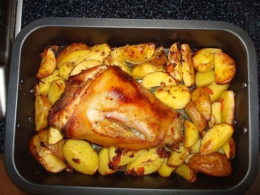 Свиная рулька в духовке нуждается в переворачивании. При этом нужно соком с противня полить и рульку и овощи.