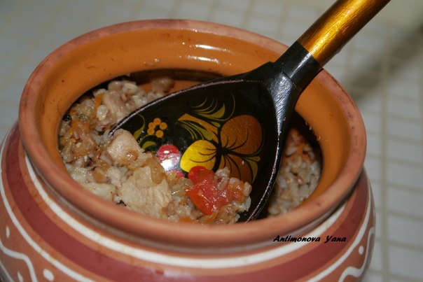 Гречневую крупу тщательно промываем и укладываем в горшочки(меньше,чем наполовину),сверху кладем содержимое сковороды.Заливаем оставшимся бульоном(чтобы он полностью закрыл мясо)накрываем крышечкой и отправляем в духовку при 180 градусах на 40-50 минут.