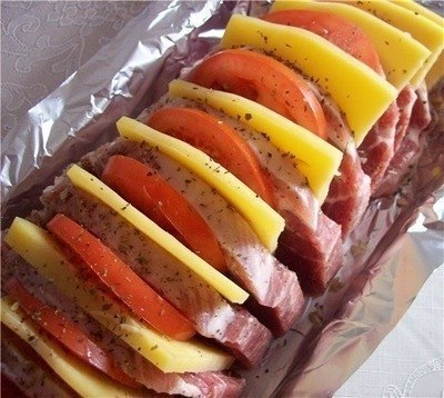 Сыр порезать пластинами толщиной 3-4 мм. Помидоры порезать кружочками. Чеснок порезать пластинками. В куске свинины сделать надрезы (не доходя до конца) с расстоянием между ними около 1 см. Свинину посолить, поперчить (в надрезах тоже). В надрезы положить ломтик сыра, ломтик помидора, чеснок.