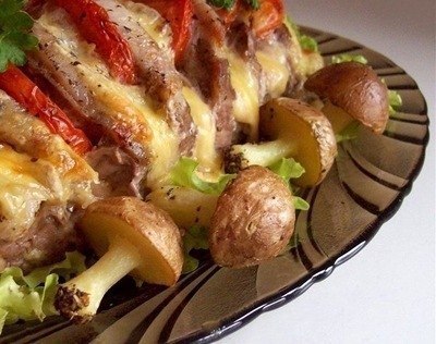 Свинина, запеченная «гармошкой», с картофельными «грибочками»