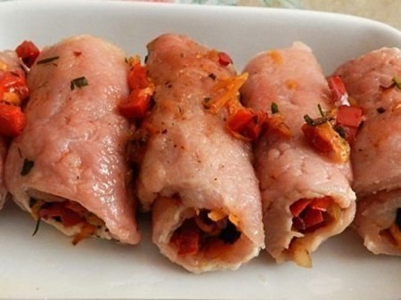 Начинку можно использовать любую на Ваш вкус. Рулетики получаются очень вкусными и сочными.