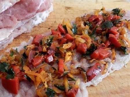 4. На мясо сверху выложить начинку и скрутить рулетом.