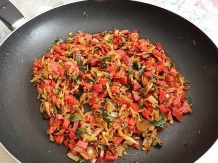 2. На растительном масле обжарить лук и морковь, добавить болгарский перец, соль, специи, немного обжарить все вместе, добавить мелкорубленую петрушку.