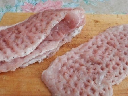 3. Мясо вымыть, просушить. Каждый кусочек свинины посолить, поперчить и отбить.