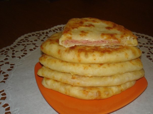 3. Полученное тесто разделить на колобки, раскатать небольшую лепешку (можно пожарить так), положить начинку (у меня — ветчина).