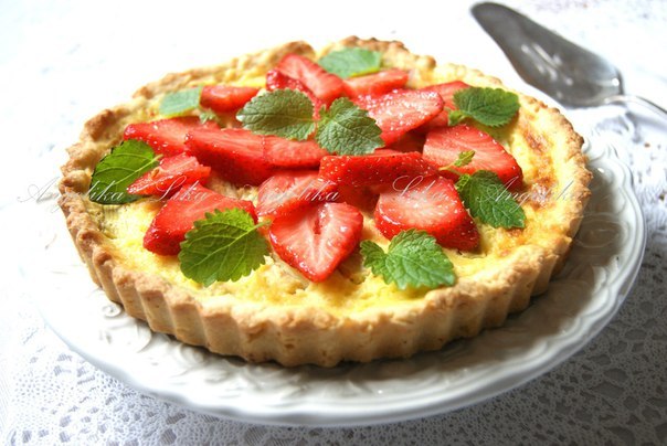 Готовый тарт охладите , украсьте свежей клубникой и листиками мелиссы или мяты . Приятного чаепития ))