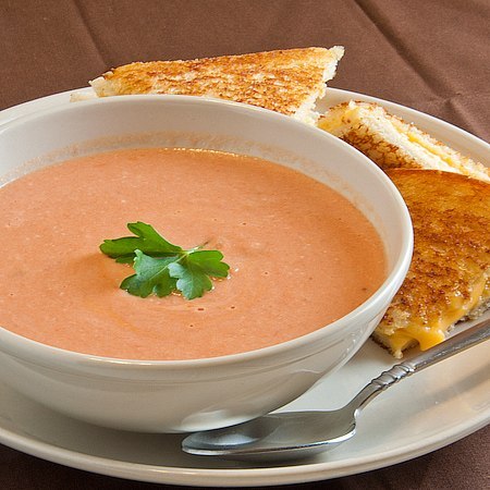 Помидоры очистить, удалить семена и нарезать кубиками смешать с томатным соком и выложить в кастрюлю, поставить на средний огнь на 30 мин. Добавить базилик и при помощи блендера измельчить до нежного гладкого состояния. Если нет специального блендера, перетрите через сито и верните в кастрюлю.