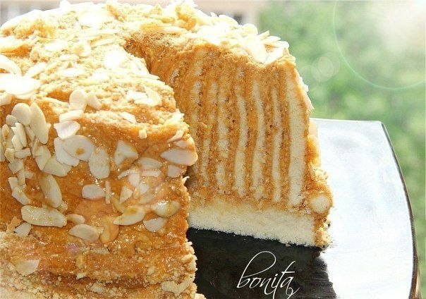 Дальше каждую полосочку смазываем сгущенкой и накручиваем на наш валик из бисквитного коржа. Если удобно можете крем наносить прямо на валик, а не на полоску. Таким образом накрутить все бисквитные полосочки. Смазываем тонким слоем весь торт, украшаем по желанию и ставим в холодильник для пропитки на 6-8 часов.