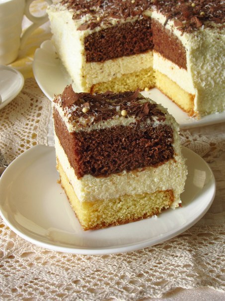 На тарелку кладем светлый корж, щедро смазываем кремом (1-1,5 см), сверху накрываем темным коржом, верх и бока смазываем кремом. Украшаем по желанию. Торт охладить ночь в холодильнике и с утра уже можно наслаждаться кусочком вкусного и нежного торта с чашечкой ароматного кофе!