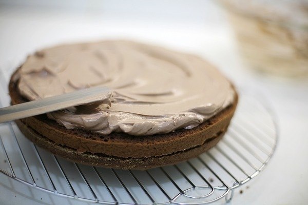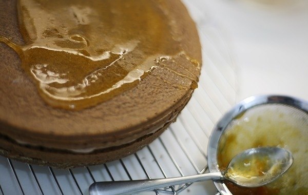 Обмазать снаружи джемом. Залить шоколадной помадой. Для этого надо растопить по 60г шоколада и сливочного масла в свч или на водяной бане, полить торт. Для торта достаточно 120г глазури, но поскольку часть будет стекать, делайте с запасом