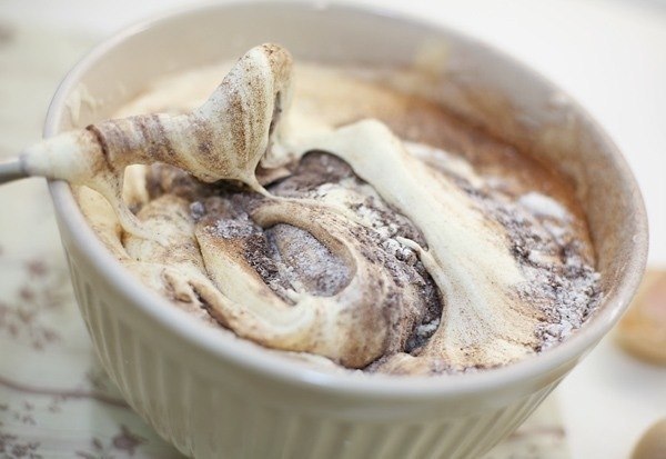 Всыпать муку, просеянную с какао, перемешать, делая ложкой движения от края к середине, тщательно, но осторожно. Влить по краю 40г растопленного масла, остуженного до т-ры 28-30С, перемешать.
