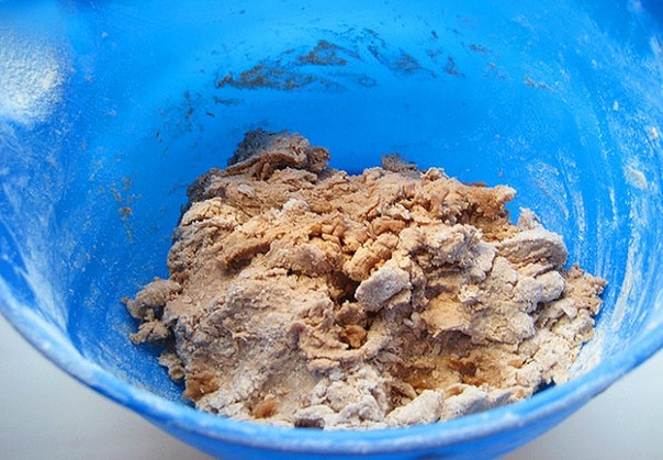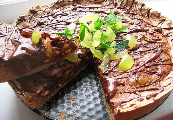 Понадобится 150гр. шоколадного масла, 1 яйцо, 1/2 стакана сахара, 4 ст. ложки 10-процентных сливок, мука 1,5ст. Для начинки: 2 яйца, 1/2 стакана 10-процентных сливок, 100гр. молочного шоколада, 200гр. винограда, 1/2 стакана кешью (или других орехов), сахар по вкусу (1 ст. ложка).