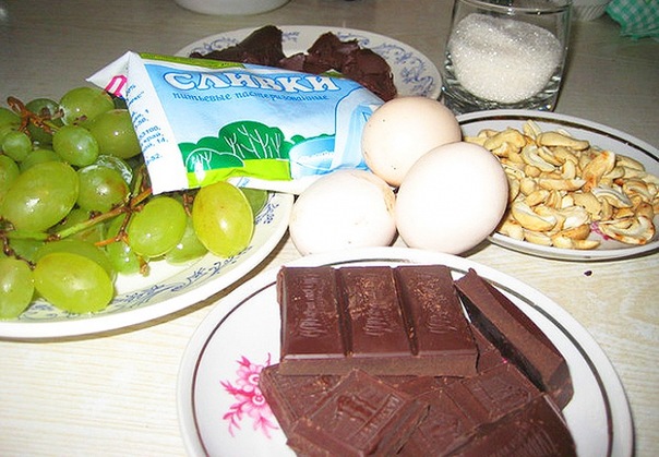 Шоколад растопить на водяной бане, остудить до комнатной температуры. Яйца взбить со сливками и растопленным шоколадом, добавить сахар. Виноград разрезать вдоль, удалить косточки. Орехи подсушить.Виноград и орехи соединить с шоколадным соусом