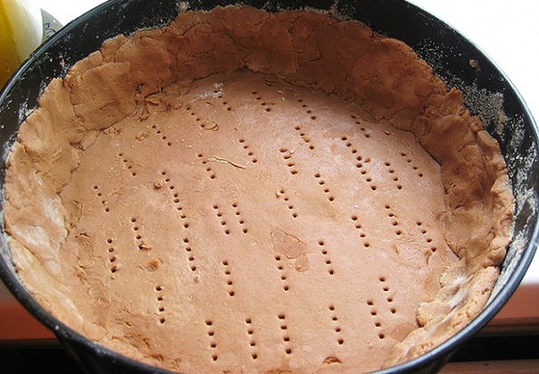 Тесто раскатать, выложить в форму, сделав бортики. Наколоть вилкой, выпекать 15 минут при 180 градусах.