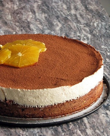 5. Оставшийся апельсин очистите, снимая кожуру с белым слоем, и нарежьте кружочками. Освободите торт от формы, присыпьте какао и украсьте апельсином.