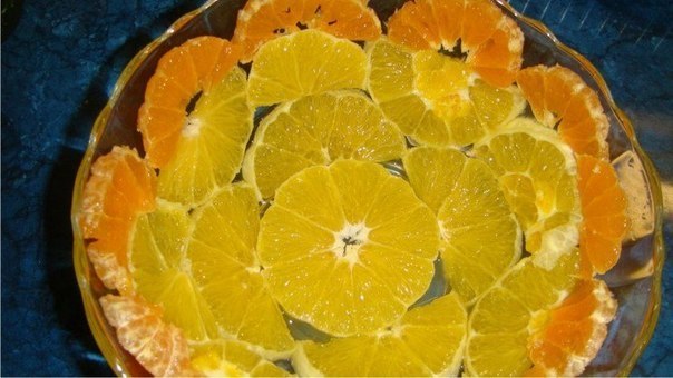 Очистить апельсин и мандарин и нарезать кружочками. Выложить на дно стеклянной салатницы кружок апельсина, потом разрезая кружки пополам выложить всю салатницу апельсином, и мандарином – как подсказывает фантазия.