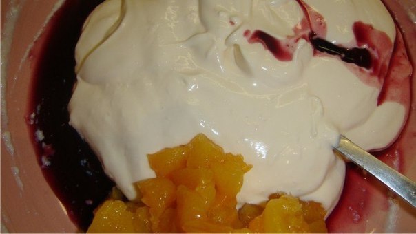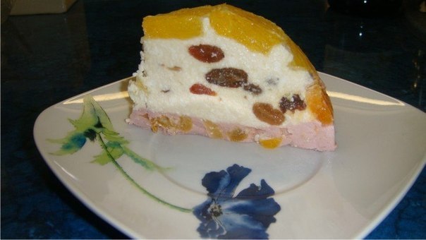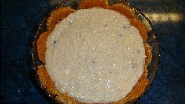 Желатин растворить на водяной бане и 2/3 части добавить помешивая в творожную массу. При помощи столовой ложки положить творожную массу на апельсины – не выливать, чтобы не сместились кусочки апельсина и мандарина.
