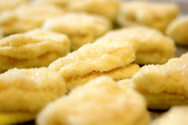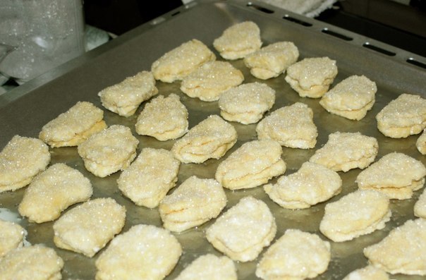 Муку высыпать на деревянную доску или покрытый стол, положить не замороженное, но холодное масло и мелко порубить ножом, добавить творог и быстро вымесить тесто, чтобы масло не растаяло. Разделить тесто на несколько частей, скатать колбаски и порезать на кусочки. Насыпать сахар в глубокую тарелку. Каждый кусочек мокнуть в сахар и придавить(сделать плоскую лепёшечку), сложить пополам(сахаром внутрь), снова мокнуть и придавить, сложить сахаром внутрь и снова мокнуть одной стороной. Противень смазать маслом, выложить на него печенье сахаром вверх и поместить на средний уровень в разогретую до 200 градусов духовку. Минут через 15-20 начинайте проверять готовность. Оно должно быть светлым, но слегка подрумяненным! Тогда оно будет хрустящим снаружи и мягким и влажным внутри.