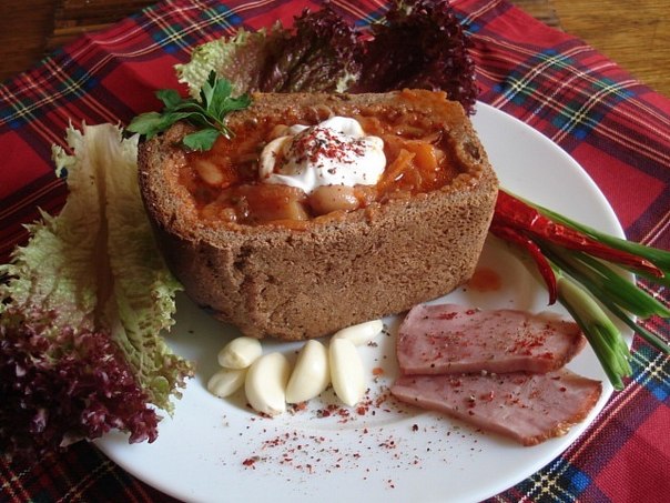 Хлеб бородинский (у меня елитный с изюмом и орехами, но лучше брать обычный), разрезать вдоль на две части, мякиш выбрать, оставив только корочку. Борщ налить в импровизированную хлебную тарелочку, полить сметаной, украсить зеленью и немедленно подать к столу !!! По мере поедания борща, хлеб можно отщипывать )))Обязательный атрибут к борщу это чеснок и лук и САЛО !!!!