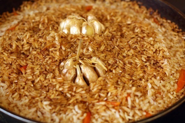 Когда основная часть воды впитается, возвращаем чеснок в середину, посыпаем рис слегка растертой зирой и плотно закрываем крышкой. Если плотной крышки нет, можно накрыть плов перевернутым блюдом, а уже сверху крышкой