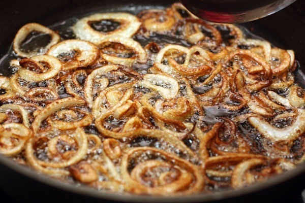 На хорошо разогретую сковороду налейте масла и дайте ему нагреться. Лук, опущенный в масло, должен вызывать бурление масла. Жарьте лук на большом огне до золотисто-коричневого цвета. Из него должен уйти сок.