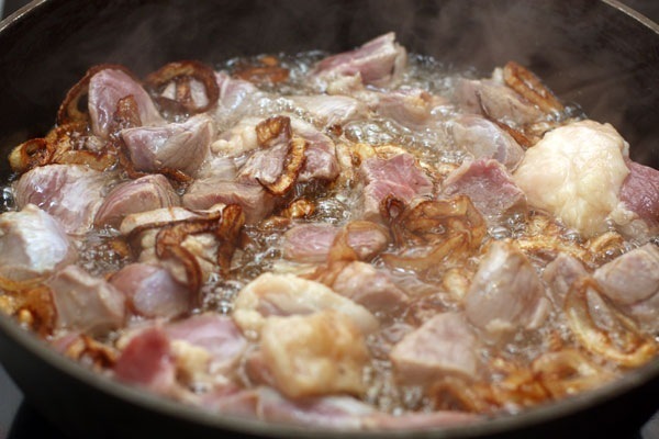 Теперь кладем мясо, очищенное от жил и нарезанное кубиками. Огонь все также большой. Обжариваем мясо, один раз перевернув, пока оно не подрумянится.