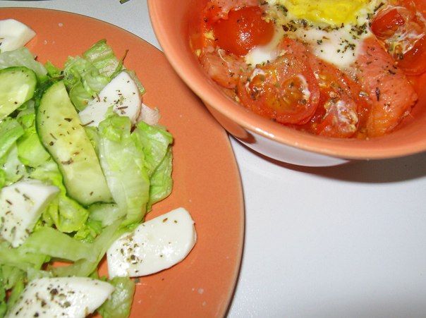 Емкость смазываем оливк. маслом, кладем нарезанные черри, форель с/с, яйцо, присыпаем травками и в микроволновку на 1,5 мин.