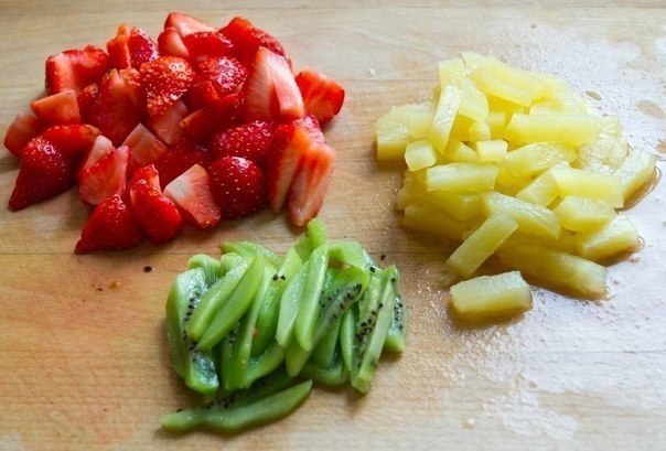 2. Фрукты вымыть, киви и ананас почистить, у клубники удалить плодоножку. Киви и ананас нарезать брусочками, клубнику разрезать на четвертинки.