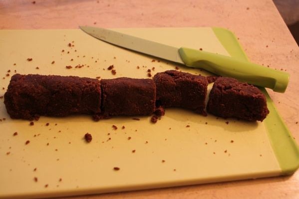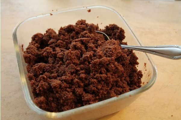 В результате получится такая вот шоколадная крошка. Если «тесто» получится сухим, добавьте в него немного молока.