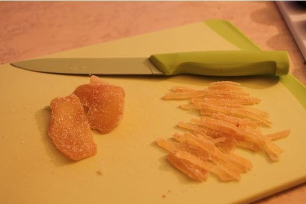 Для украшения нарезаем все те же цитрусовые цукаты очень тоненькими полосочками.