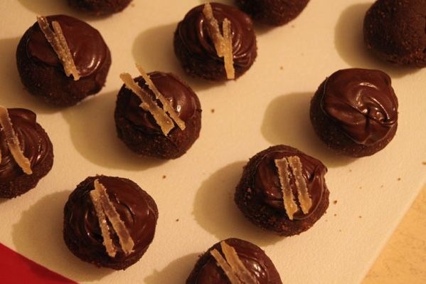 Оставшийся от приготовления теста шоколад ещё раз подогреваем до жидкого состояния. Каждое пирожное обмазываем сверху шоколадом и кладём по два кусочка нарезанных цукатов.