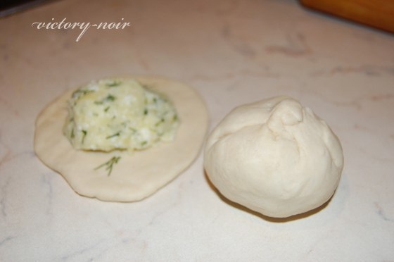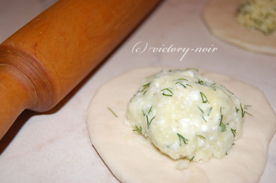 Тесто делим на кусочки, формируем из них руками лепёшки. На каждую лепёшку кладём начинку. Начинки должно быть по объёму столько же, сколько и теста.