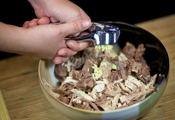 5. Очистите чеснок и выдавите его в мясную смесь, перемешайте.
